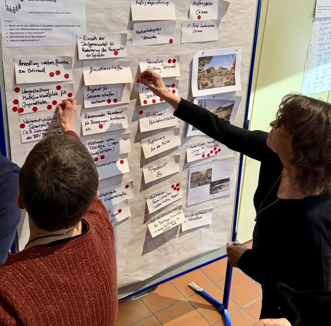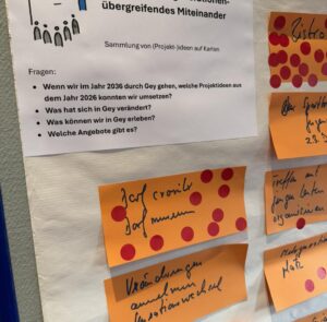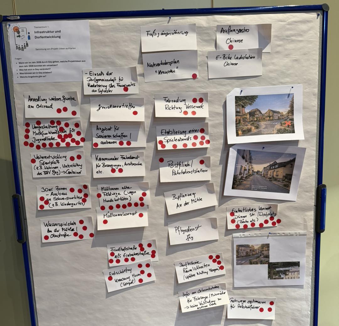 Über 50 Bürgerinnen und Bürger haben am Samstag, den 17.01.2026 im Pfarrheim in Gey ihre Ideen für die Zukunft unseres Heimatortes eingebracht. Rund drei Stunden haben wir zu den drei Themenschwerpunkten „Infrastruktur und Dorfentwicklung“, „Natur, Umwelt und Resilienz“ sowie „Dorfleben und generationenüberfreifendes Miteinander“ diskutiert und viele Anregungen gesammelt.