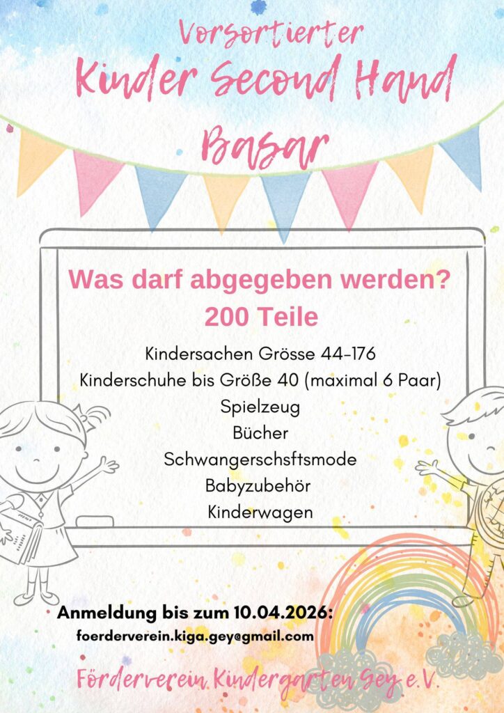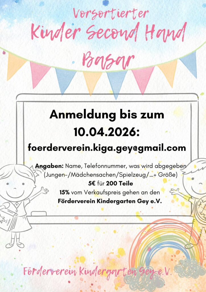 Am 18.04.2026 findet erneut der Kinder Second Hand Basar des Förderverein Kindergarten Gey e.V. im Pfarrheim Gey statt.